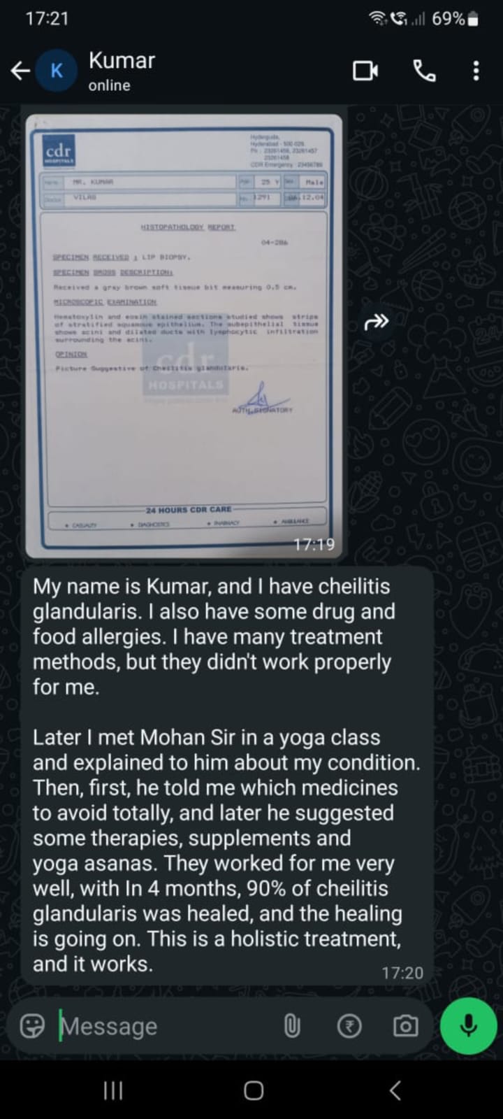 I have studied exfoliative cheilitis for 12 years. 12 years ago I came across an exfoliative cheilitis patient in a yoga class; later I came across two more exfoliative cheilitis cases, and I helped them in their healing process. I know naturopathic remedies for exfoliative cheilitis, which can heal up to 90%. Naturopathic diet therapies are to be chosen and done under proper supervision to get actual desired results. Yoga, naturopathic diet therapies, and naturopathic supplements are to be chosen wisely as per individual requirements, as they differ from person to person. Experimenting with exfoliative cheilitis without proper supervision and guidance often worsens the condition; EC patients should be mindful before experimenting.